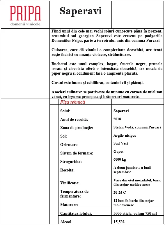 Saperavi is een variëteit van Georgische oorsprong, oud en wat in vertaling "verf" betekent. Het is ook een van de weinige verfdruivensoorten (met rood vruchtvlees, niet alleen de schil) ter wereld. Saperavi van Pripa is een donkerrode wijn met violette tinten, 12 maanden gerijpt in Moldavische eikenhouten vaten